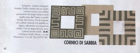Andrea Gobbi inventa nel suo studio romano cornici con sabbie provenienti da luoghi diversi come quella nera del Tirreno o quella dorata del Sahara. Poi le impasta con collanti naturali e le applica sul legno, ottenendo una superficie solida. Con la stessa tecnica sono costruiti anche i mobili. B:M: